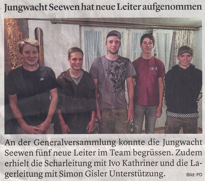 Es konnten fünf neue Leiter aufgenommen werden. Andreas Imhof, Neville Hagmann, Remo Weber, Silas Zeller und Valentin Mettler werden das Leiterteam neu unterstützen. Sie haben bereits die Leitung der jüngsten Gruppe diesen Sommer übernommen.